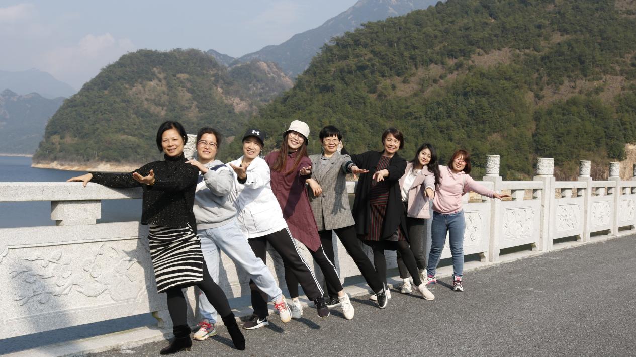 离开洋港村来到了芝堰古村。该村始建于南宋乾道年间,距今已经有近千年的历史,有元、明、清、民国等历朝历代的建筑,被誉为“中国古民居博物馆”。孝思堂、光裕堂、济美堂,既传承着古朴,又散发着文化气息,似乎还在诉说着当年的繁华。沿着村中小路,拾级而上,一会儿就来到了芝堰水库。站在坝顶,心情尤为舒畅。水面碧波荡漾,群山倒映在水中。青山,绿水,峰峦起伏的大山,美丽的风景让人流连忘返,平日生活、工作中的劳累一扫而空。爱美的女老师们抑制不住自己兴奋的心情,摆出优美的队形,摄影留念,以抒发自己的兴奋之情。