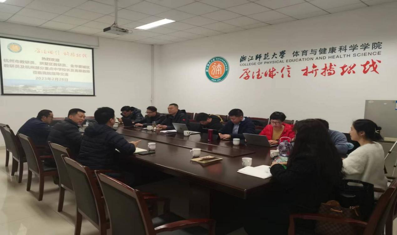 2023年2月28日上午,杭州市体育教研员、拱墅区体育教研员、金华婺城区体育教研员及杭州部分重点中小学校校长与高级教师一行9人来我院交流。学院党委书记姜洪友、副院长关志逊、何晓龙参加会议,会议由党委书记姜洪友主持。党委书记姜洪友向客人简要介绍了学院的基本情况,他指出,学院在中小学体育教育教学研究和师资教师培训方面有着丰富的经验和优势,希望双方在这方面加强合作,希望来自体育基础教育一线的教师对学院人才培养工作提出宝贵意见。双方就加强师资培训、提高中小学教师教研能力、人才培养过程性指导、学生实践就业基地等方面进行了深入交流和探讨。