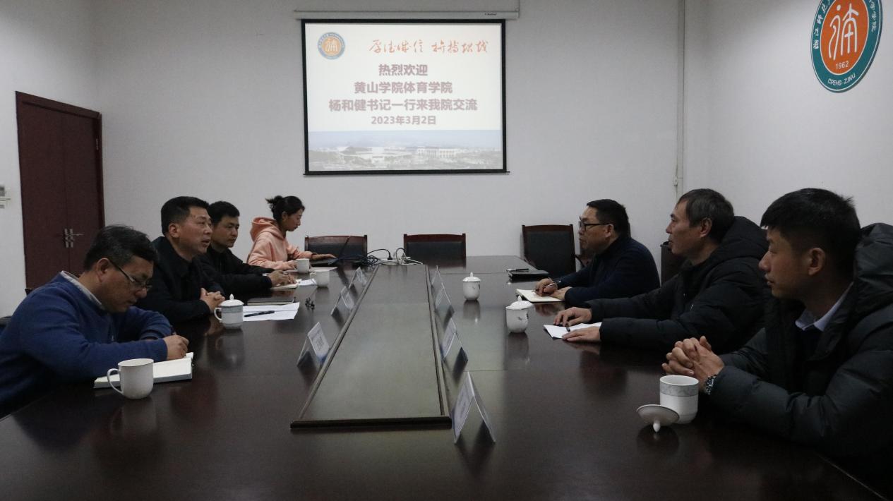 2023年3月2日,黄山学院体委副主任、校体委办公室主任、体育学院党总支书记杨和健一行4人来我院交流,党委书记姜洪友,党委委员、公体部主任沈军,办公室主任王海红参加座谈会,会议由党委书记姜洪友主持。双方就党的建设、专业建设、课程思政、大学体育俱乐部改革、学生运动竞赛等议题进行了交流与探讨。