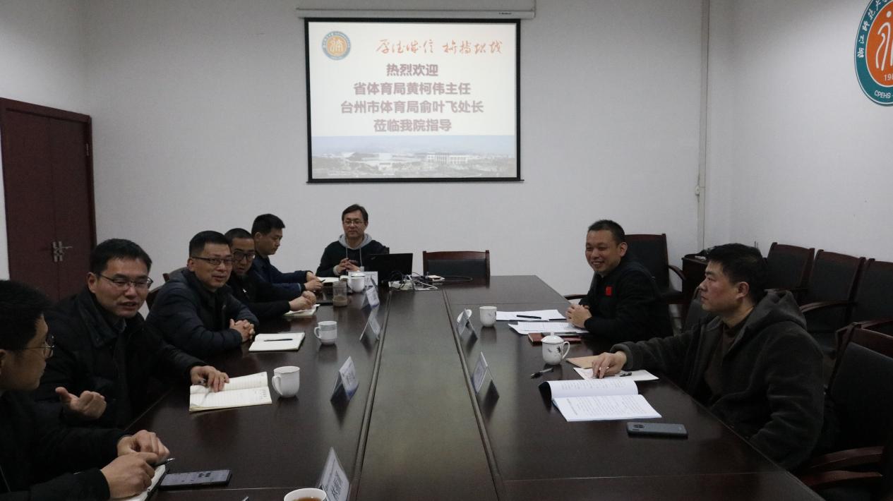2023年2月16日,浙江省体育局群体处一级主任科员黄柯伟、台州市体育事业发展中心群体处负责人俞叶飞一行来我院指导交流,全体班子成员参加座谈会,会议由院长李启迪主持。