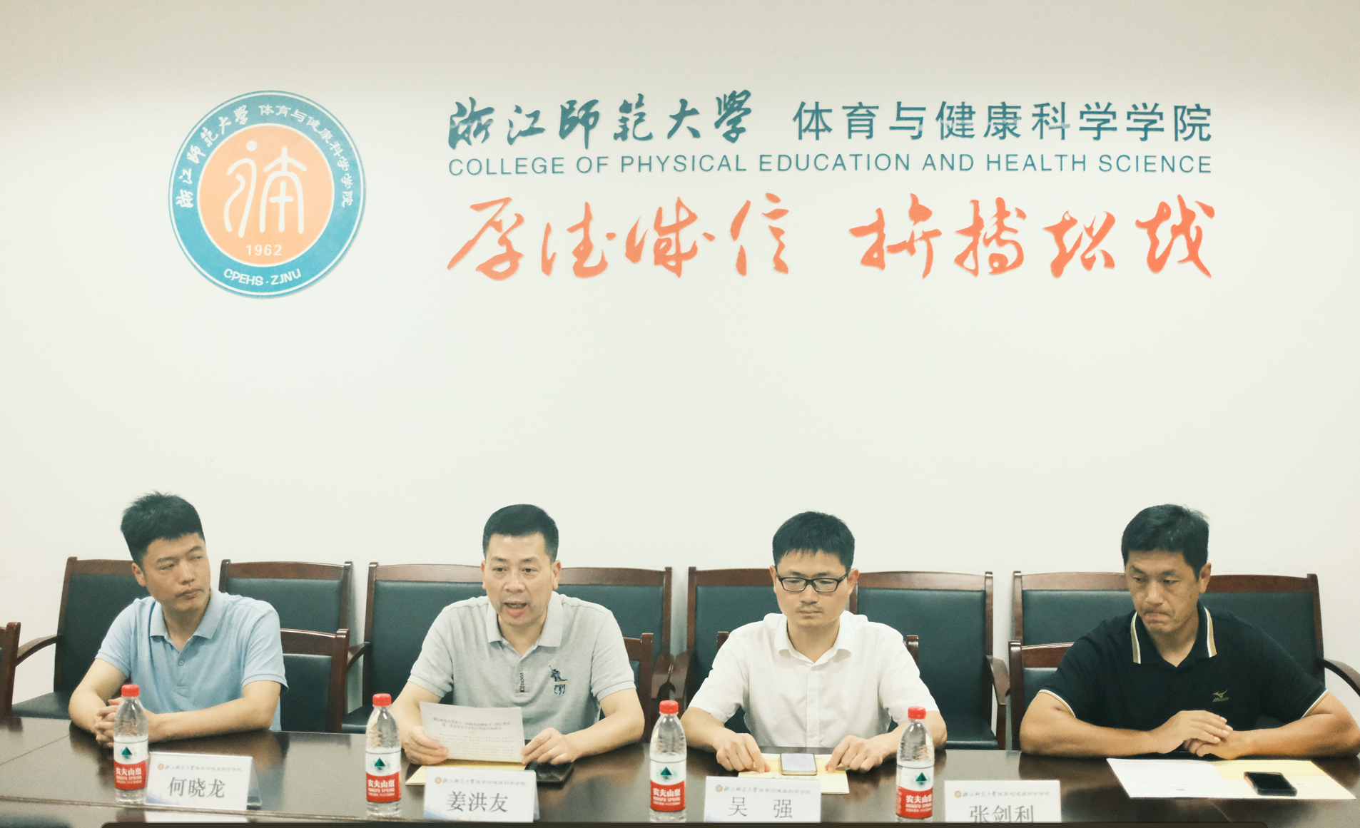 6月22日下午,由中华人民共和国教育部中外语言交流合作中心主办,浙江师范大学承办的“活力浙江”居民体育健身线上体验营开班仪式在学院第一会议室举行。学校国际交流与合作处副处长吴强、学院党委书记姜洪友、副院长何晓龙, 以及参加培训的120学员参加开班仪式。本次培训项目负责人张剑利老师主持会议。本次体验营是“汉语桥”线上团组项目,项目设计旨在学员通过体育学汉语、透过浙江看中国,旨在让各国青年了解中国全民健身开展情况和中国优秀传统体育文化,了解习近平总书记倡导的“人类命运共同体”深刻内涵。