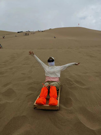 观莫高窟:一排长约1600 米的洞窟组成,壁画有 45000 多平方米、彩塑,共2415 尊。难得的敦煌雨中,我们倾听导游的讲解回顾历史,在最先进的影院观看记录片,晚上亲身现场感受《又见敦煌》的魅力,深深自豪于祖国的璀璨艺术。