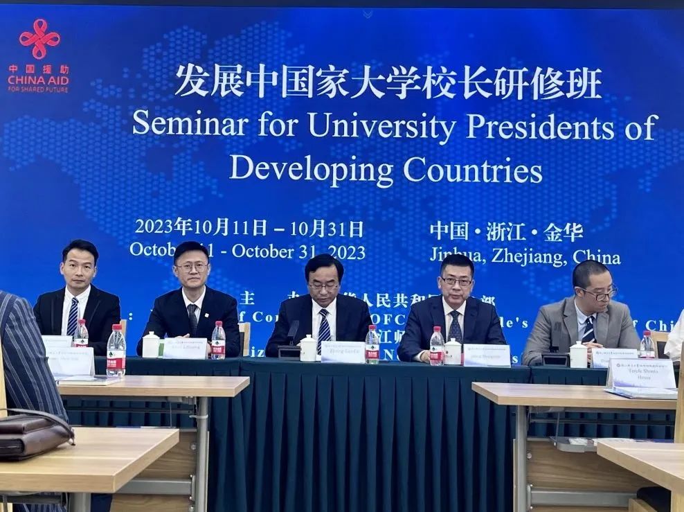 10月11日上午,由中华人民共和国商务部主办,浙江师范大学承办的发展中国家大学校长研修班开班仪式在正阳楼3号楼1号会议室举行。副校长张根福、学院党委书记姜洪友、国际交流合作处副处长沈立煌、学院党委书记姜洪友、副院长关志逊、本次培训项目负责人郑哲老师以及参加培训的学员与会,开班仪式由关志逊副院长主持。