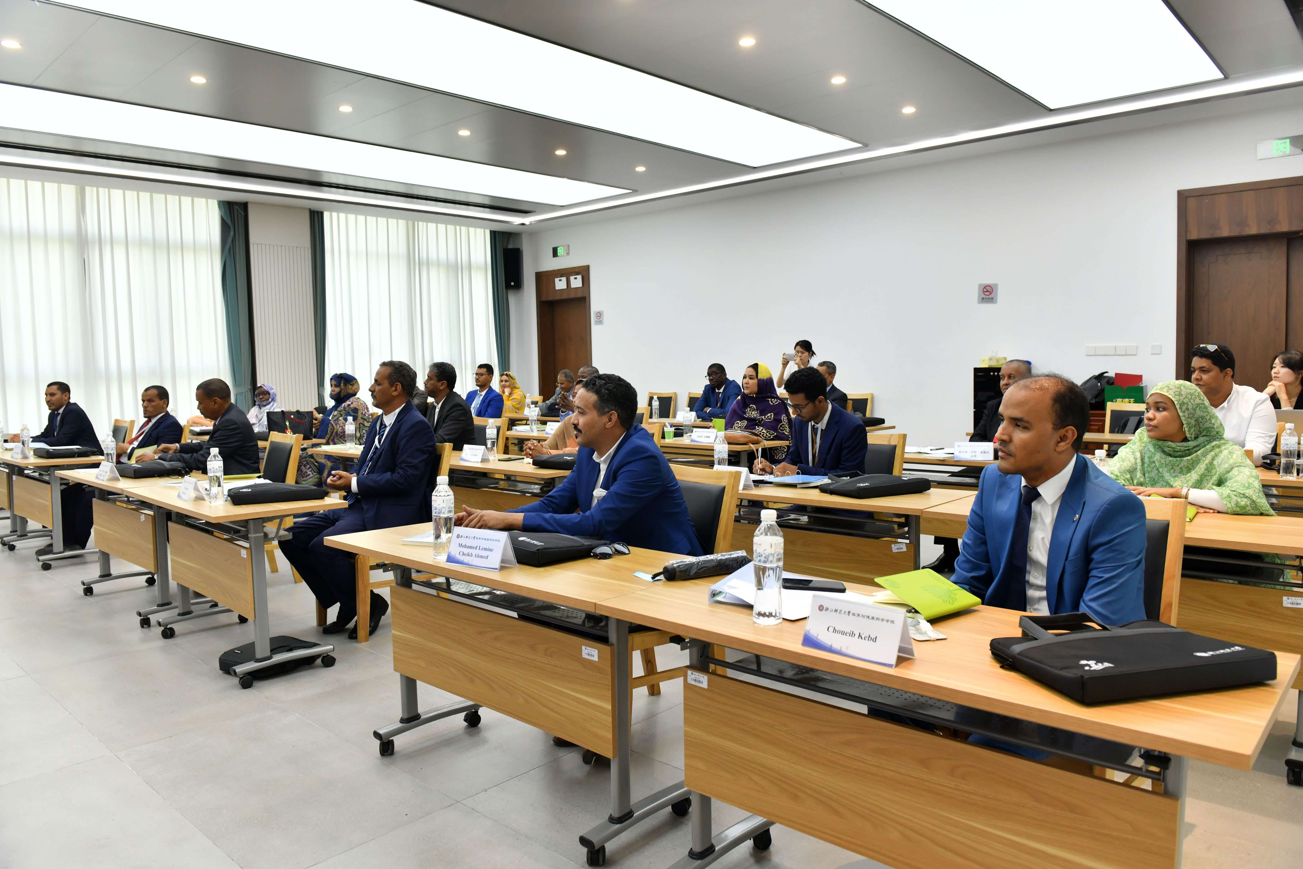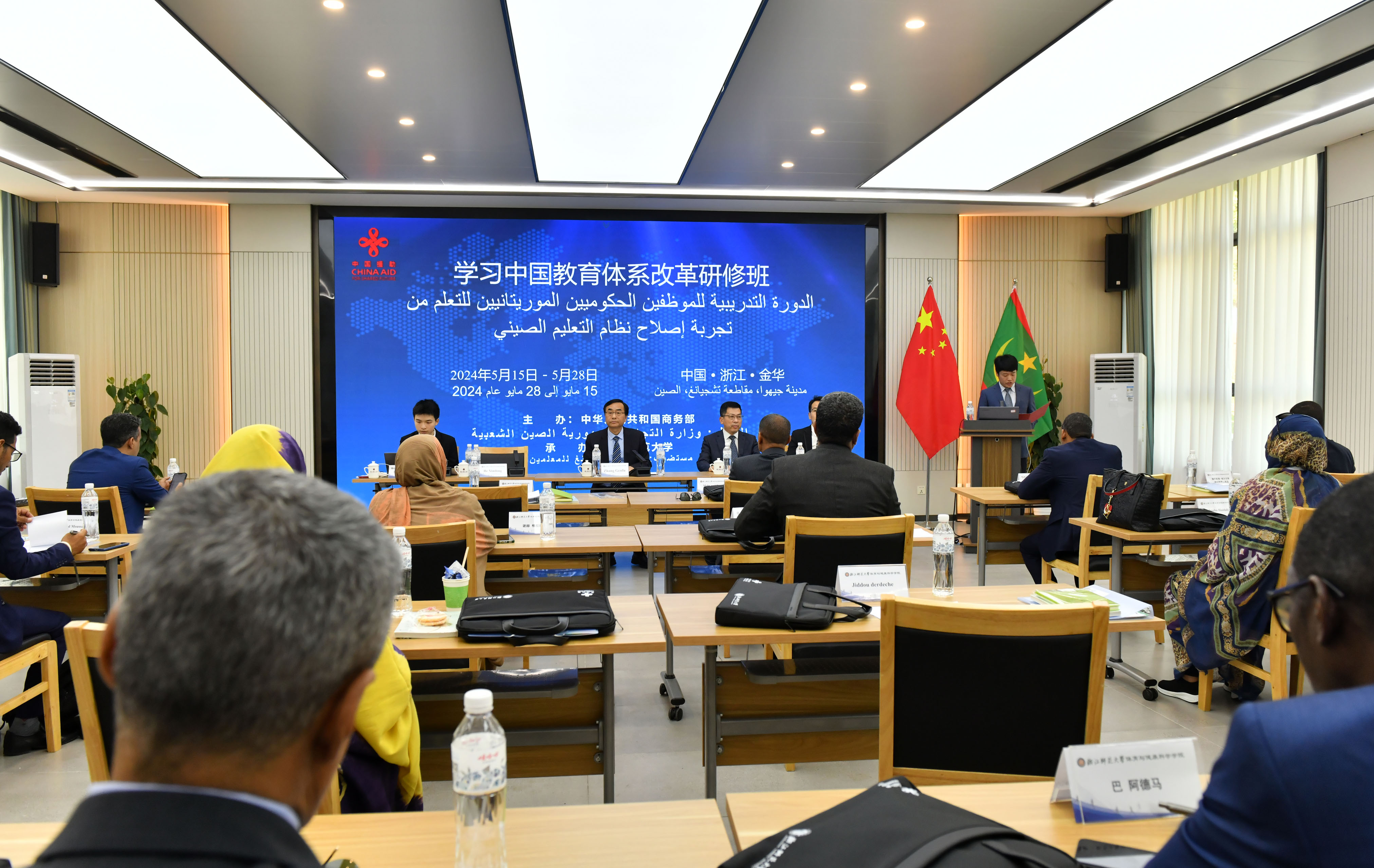 5月15日下午,由中华人民共和国商务部主办,浙江师范大学体育与健康科学学院承办的“毛里塔尼亚学习中国教育体系改革研修班”开班仪式在正阳楼3号楼1号会议室举行。浙江师范大学校务委员会副主任、原副校长张根福,体育与健康科学学院党委书记姜洪友、项目负责人郑哲、班主任叶梦馨以及来自毛里塔尼亚外交部、教育部、高教部、就业部、财政部、经济部、商业部、石油部、装备运输部、努瓦克肖特大学等部门单位的29名学员参加开班仪式。开班仪式由体育与健康科学学院副院长何晓龙主持。